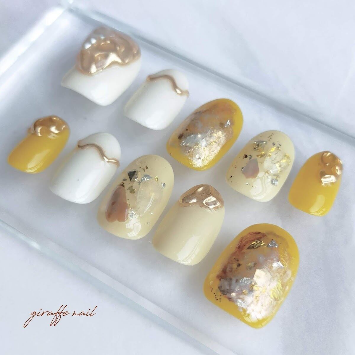 淡いくすみイエローをベースに、ゴールドで華やかさもあるニュアンスデザインにしました!