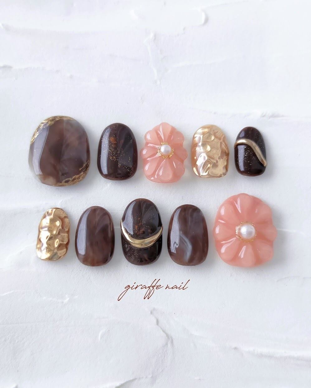ブラウンネイルにはゴールドの箔を仕込んでありますので、奥行きを感じられ、上品さも兼ね備えたデザインです✨