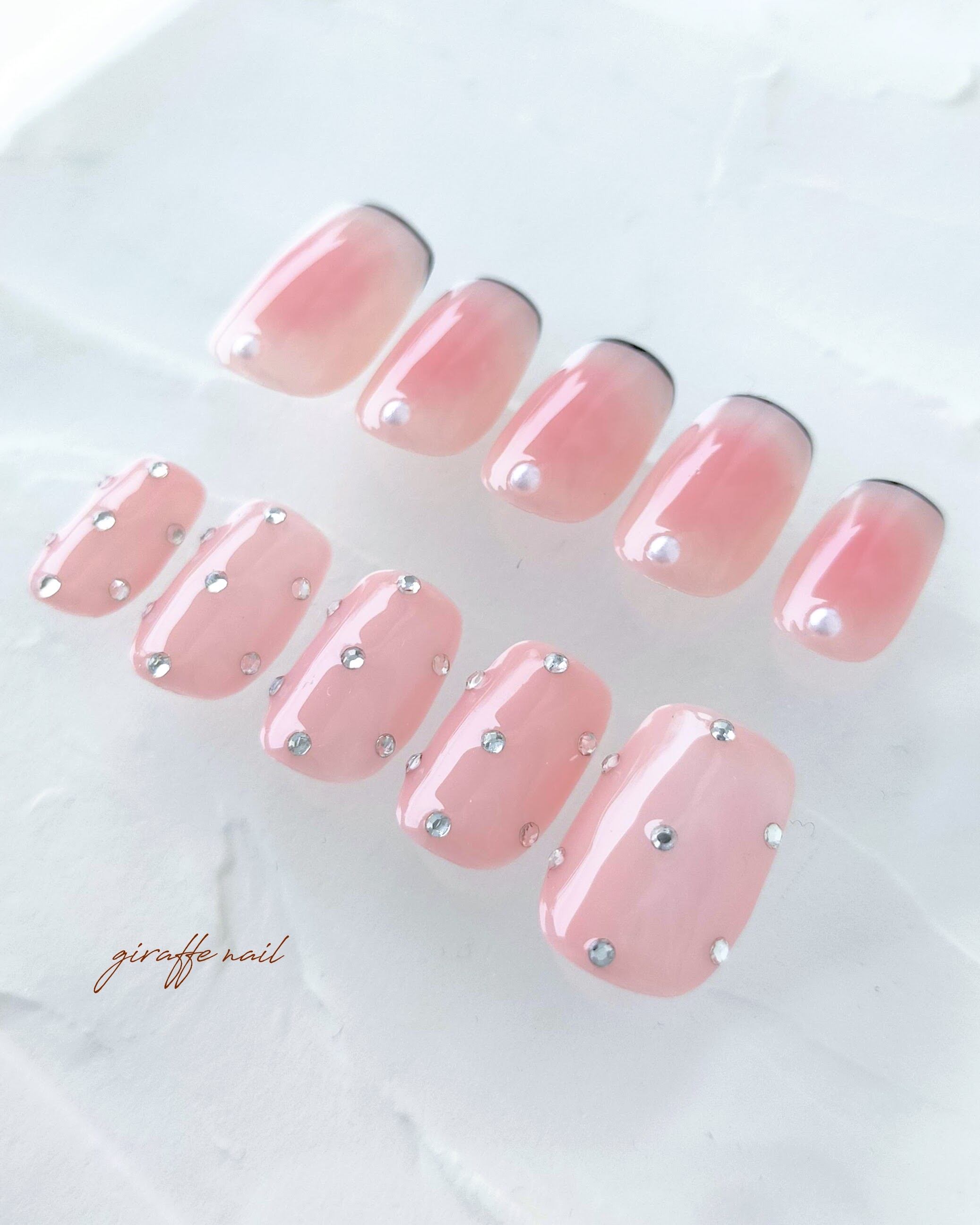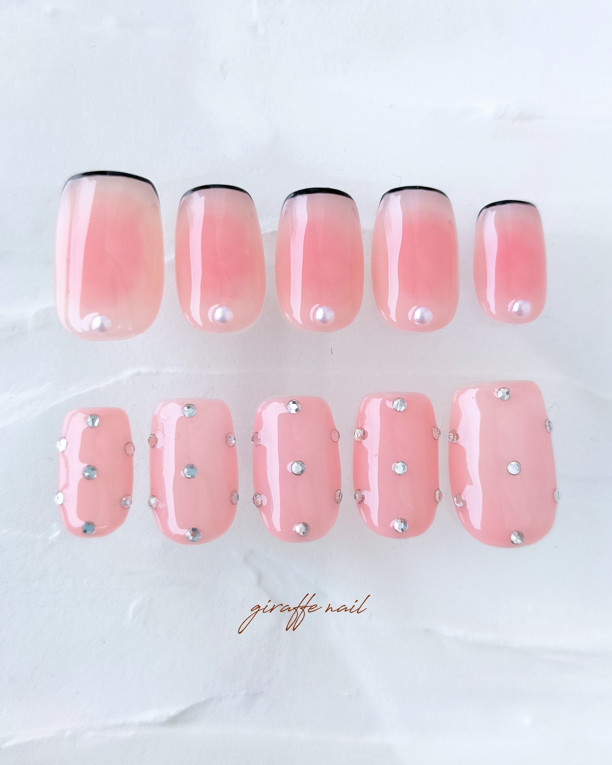 中心からじゅわっと熟れたようなピンクのチークネイルに極細の黒フレンチで引き締め感を出しました